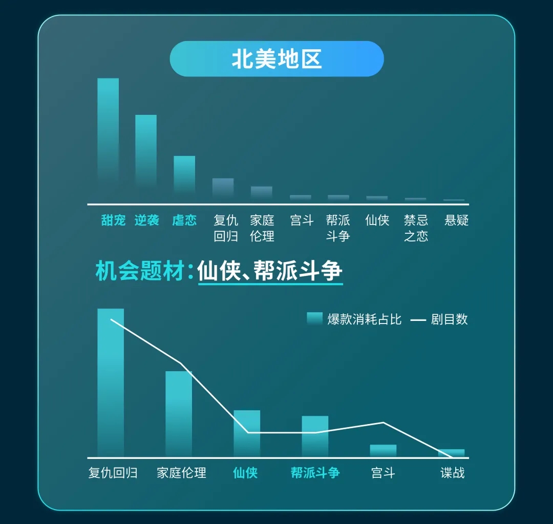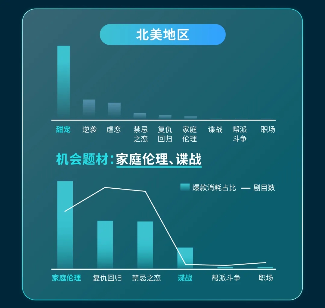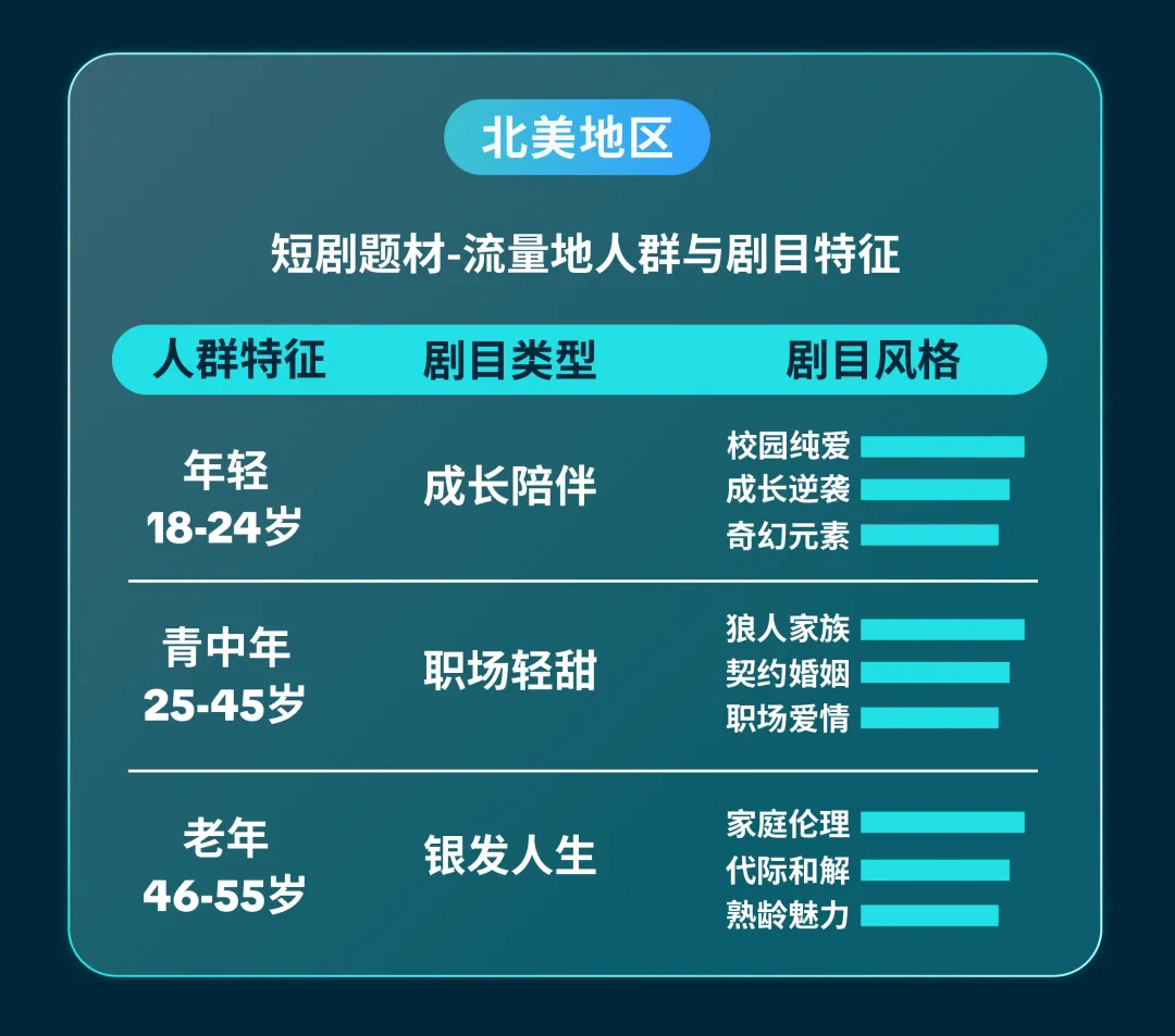 想让短剧在不同地区都能炸出热度,关键在于实现 “人群特征 × 剧目类型 × 剧目风格” 的深度适配,针对不同市场量身定制内容,才能打造出贴合当地观众喜好的爆剧。以北美地区这一全球视角下的核心流量地为例,我们将从人群需求到剧目适配特征,逐一拆解其中的关键逻辑: