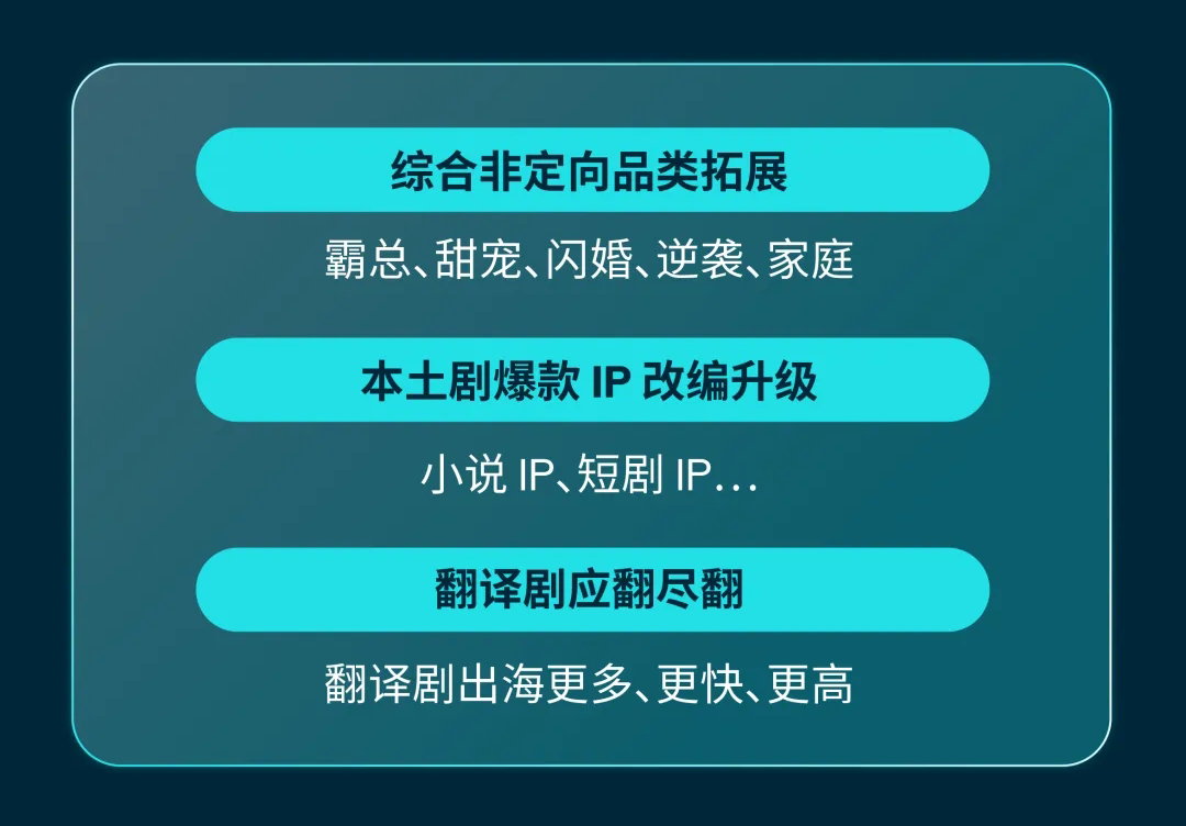 内容是短剧的核心竞争力,在行业成长期,需通过精细化内容布局双向发力:一方面拓展题材品类、升级内容质感,另一方面通过 “本土剧自制发力 + 翻译剧应翻尽翻” 提升剧目产能。